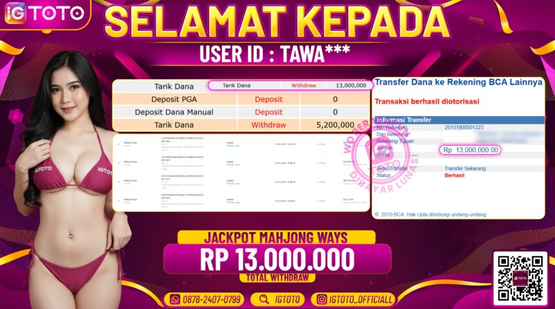 Read MoreBUKTI JACKPOT IGTOTO– Selamat kepada member setia IGTOTO ID : TAWA*** dengan Jackpot Rp. 13.000.000,- pada permain slot games igtoto .