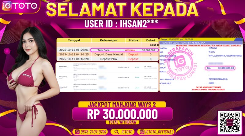 Read MoreBUKTI JACKPOT IGTOTO– Selamat kepada member setia IGTOTO ID : IHSAN22*** dengan Jackpot Rp. 30.000.000,- pada permain slot games igtoto .