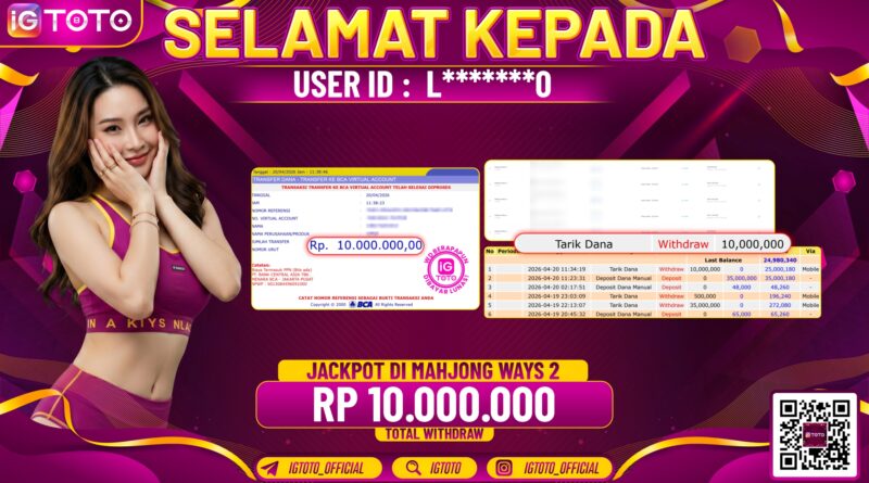 BUKTI JACKPOT IGTOTO– Selamat kepada member setia IGTOTO ID : L*******0 dengan Jackpot Rp. 10.000.000,- pada permain slot games igtoto . Pencairan kemenangan tidak butuh waktu yang lama pasti langsung cair. Modal bermain kecil cuan jutaan rupiah, masih bingung mencari situs bandar online yang aman dan terpercaya ? Solusinya hanya ada di IGTOTO bossku sayang. Proses deposit dan withdraw hanya hitungan detik bahkan hitungan menit saja tanpa bertele – tele , Minimal deposit rendah hanya Rp. 5.000,- dan minimal Withdraw Rp. 25.000,- saja anda sudah bisa menikmati berbagai macam permainan cukup dengan 1 akun saja, mengapa bingung ? langsung bergabung saja dan klik link dibawah ini untuk akses lebih lancar dan mudah :